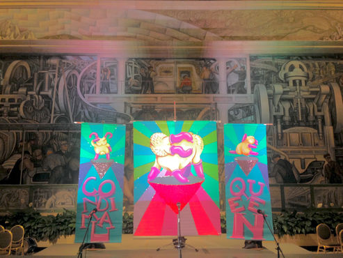 Condimal for President brings us to Election Night, where Condimals press secretary, a drag maiden named Connie, expresses Condimals platform on accordion, by means of Tina Turner’s “Simply the Best”. As the election results come in and Condimal wins by a landslide, the American flag is replaced with an image of the triumphant condimal, striking a pose atop a glittering pink triangle. With heels, camp, and nationalistic satire, Condimal for President is a response to rising HIV rates in young people, with the desire to create a Pop Icon who can speak directly to youth asking for their vote toward a future without HIV.